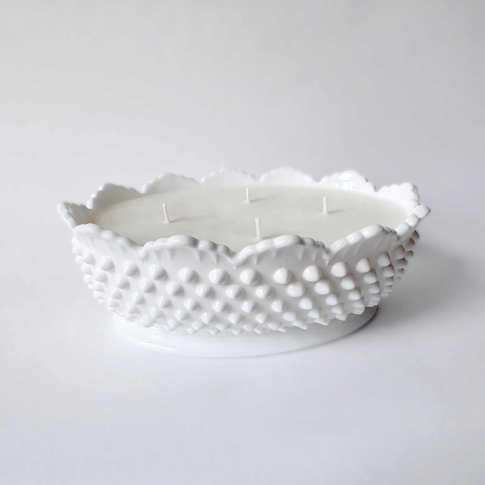 The Hobnail Oval Luminary 4-wick candle celebrates one of the most beloved designs in American glass history. Introduced by the Fenton Art Glass Company in 1939, the hobnail pattern features a field of raised glass studs — inspired by Victorian “dew drop” glass — that shimmer beautifully under candlelight. This mid-century oval vessel, crafted in milky white opaline glass with a scalloped edge, was part of the line that helped secure Fenton’s legacy in the 1950s. Hand-poured with our signature coconut beeswax blend, it transforms a cherished collectible into a radiant centerpiece that bridges nostalgia, craftsmanship, and light.