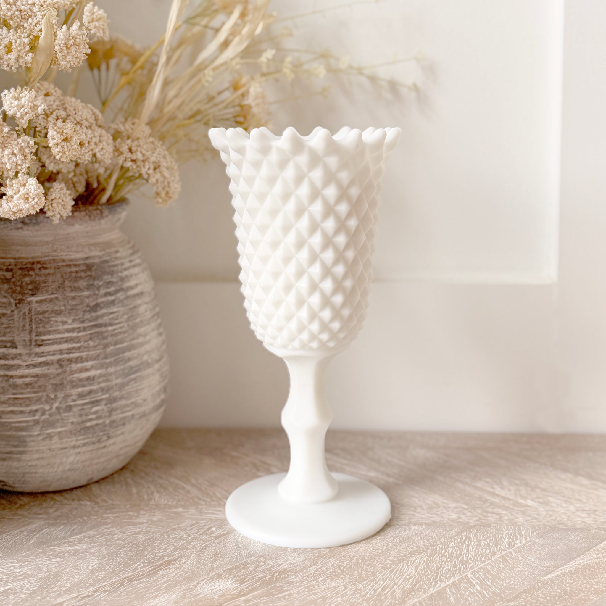 The Diamond Hobnail Celery Candle showcases the iconic diamond English Hobnail pattern. Originally a celery vase once displayed proudly on Victorian dining tables, this elegant milk glass goblet brings historic charm and sculptural texture to modern interiors. The vessel has been reimagined as a candle centerpiece.