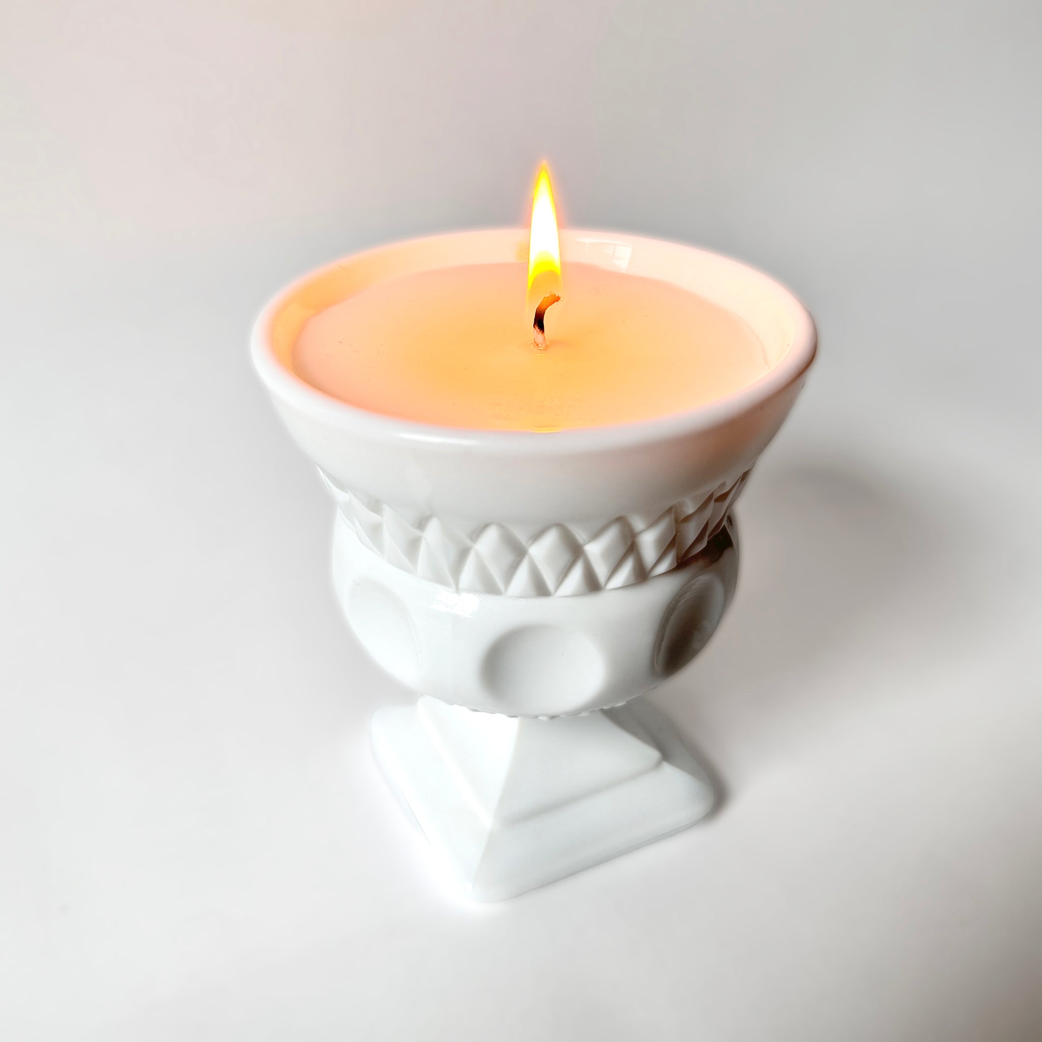 Milk glass has captivated us for more than a century with its luminous, milky-white glow and timeless artistry. First created in Venice in the 1500s, it rose to prominence in the United States during the late 19th and mid-20th centuries through legendary glassmakers such as Fenton, Westmoreland, Indiana Glass, Fostoria, and E.O. Brody. Known for its opaline sheen, hand-pressed textures, and ornate motifs, from hobnail and lace to diamond patterns and cabbage rose, milk glass was once a hallmark of refinement, displayed proudly in parlors and on dining tables across America. Today, each vintage piece endures as a symbol of craftsmanship and nostalgia — reimagined by True Vintage Candle as a hand-poured luminary that transforms history into light for you to enjoy.
